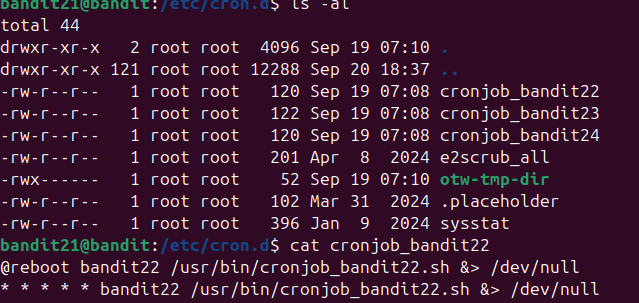 디렉토리 목록에서 cronjob_bandit22 파일을 열어보았고 표준출력과 표준에러를 동시에 리디렉션하는 &> 기호와 /dev/null을 통해 정상출력과 오류출력을 휴지통으로 리디렉션하는 것을 확인할 수 있다.